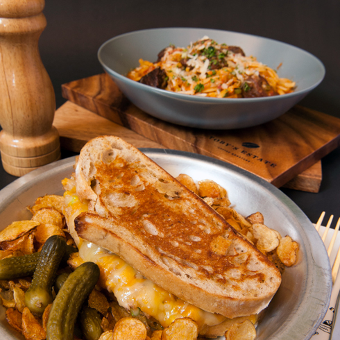 Three cheese and tuna salad on sourdough with chips
