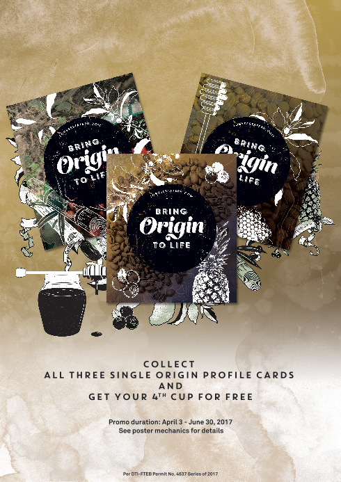 4. Guests must present and surrender one of each Single Origin info cards: Ethiopian Konga, Mt. Kalatungan, Costa Rica El Jaguar to claim their complimentary Single Origin brew.