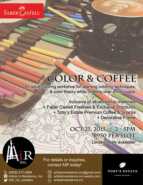 October 21, 2015: Artists In Residence will be conducting an adult coloring workshop at our Whitespace branch along Chino Roces extension. For details or inquiries, call (02) 728-0777.